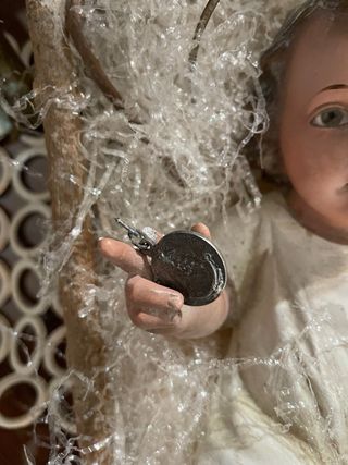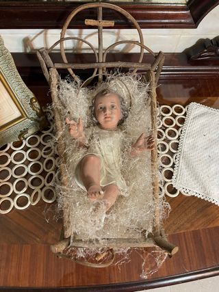 Figura de un niño Jesús acostado en una cuna de madera y ramas. - Cuna rústica con detalles de ramas. - Figura del niño Jesús con vestimenta. - Base de material similar a paja o heno. - Con medallita en la mano y ratura en el dedo (ver imagen) - Se escuchan ofertas.