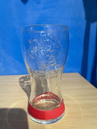 Vaso conmemorativo de Coca-Cola de la Eurocopa 2012. Presenta un diseño grabado con el logo del evento y la marca. - Diseño grabado UEFA EURO 2012. - Base roja con logo Coca-Cola.