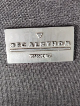 Placa de aluminio con el logo de GEC ALSTHOM y la palabra TRANSPORTE. - Material: Aluminio. - Grabado: GEC ALSTHOM. - Texto adicional: TRANSPORTE. 9cm largo por 4,5 de ancho
