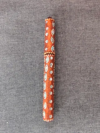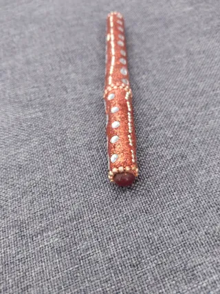 Elegante boli de origen marroquí con un diseño único. - Cuerpo decorado con detalles brillantes y pedrería. - Color base naranja con adornos plateados y celestes.