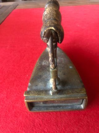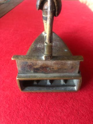Pieza de colección antigua, una plancha de bronce con un diseño clásico muy antigua mide de altura 14 cm anchura 17 cm con pátina y mango de madera original sin limpiar.Por Favor OFERTAS NO - Material: Bronce. - Estilo: Decorativo y antiguo.