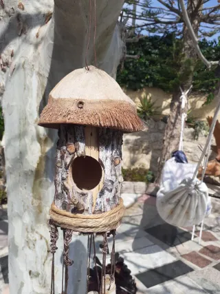 Decoración colgante para exteriores hecha de bambú. - Diseño artesanal con tubos de bambú. - Techo de paja y detalles rústicos. - Cuerda para colgar incluida.