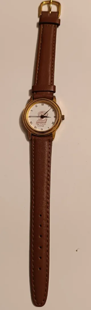 Conjunto de cuatro relojes de pulsera con correa de cuero marrón y detalles dorados. - Esfera blanca con logo de The Point Group. - Indicadores horarios romanos y líneas. - Correa de cuero marrón con hebilla dorada. Las medidas son: Largo 21cm Diámetro esfera 2cm