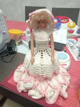 Muñeca Barbie con un precioso vestido hecho a mano de crochet en blanco y rosa. Incluye un pequeño bolso a juego. - Vestido de crochet blanco con detalles en rosa. - Sombrero a juego. - Bolso de mano de crochet. - Adornos de perlas.