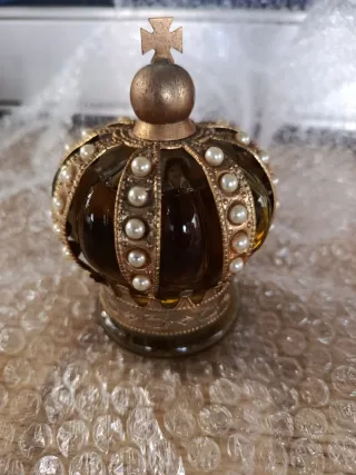 Frasco de perfume antiguo con un diseño de corona adornado con perlas. Perfume años 50/60. Está lleno, el envase como se puede ver presente alguna señal del paso del tiempo, de ahí su precio . Contiene 115 ml . - Diseño de corona. - Detalles de perlas. - Frasco de vidrio ámbar.