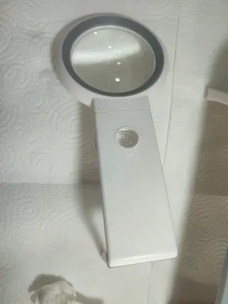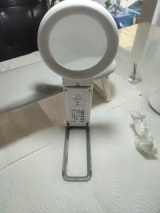 Lupa de la marca KIBTOY con un diseño moderno y funcional. Perfecta para tareas que requieren precisión. - Lente circular con luz LED integrada. - Base plegable para facilitar su almacenamiento y transporte. - Modelo: L-803. - Fabricada en China.