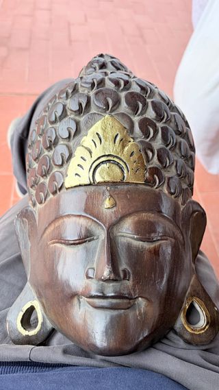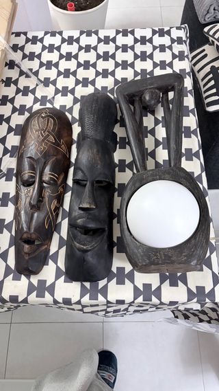 Conjunto de tres máscaras y una lámpara. - Máscara de madera oscura con tallado detallado. - Máscara de madera negra con rasgos faciales marcados. - máscara tipo indú - Lámpara de madera con pantalla esférica blanca. Hay que poner interruptor