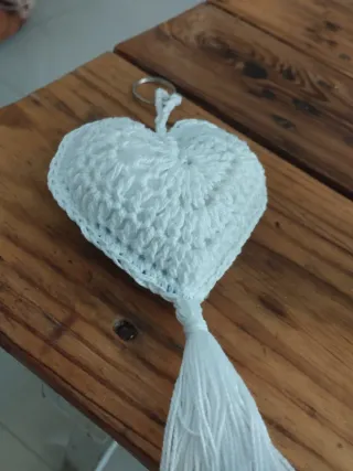 Llavero artesanal con forma de corazón tejido a mano. - Diseño de corazón en color azul. - Borde exterior en color blanco. - Incluye borla decorativa en color blanco. - Adornado con un aro metálico para llaves.