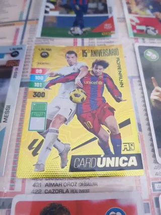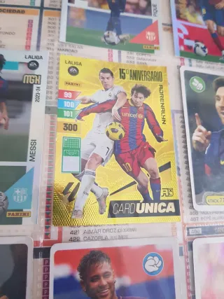 Carta coleccionable 15º Aniversario de LaLiga, con los jugadores Cristiano Ronaldo y Lionel Messi. - Edición especial Card Única. - Incluye estadísticas de juego. - Diseño dorado conmemorativo.