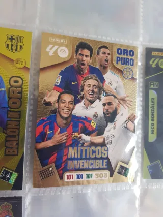 Tarjeta Panini Oro Puro de Míticos Invencibles. - Incluye a jugadores como Messi, Cristiano Ronaldo, Modric y Benzema. - Diseño dorado con detalles en relieve. - Números de jugador: 101, 101, 101, 303.