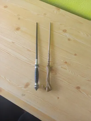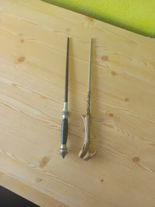 Dos varitas inspiradas en el mundo de Harry Potter. - Varita con mango negro y detalles plateados. - Varita con mango de madera y diseño intrincado.