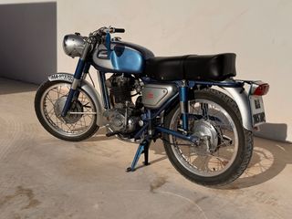 Moto clásica Ducati Deluxe 250 cc en color azul y plateado. Restaurada al 100% tanto carrocería como motor. Un modelo icónico para coleccionistas. - Diseño vintage. - Ruedas de radios. - Asiento negro.