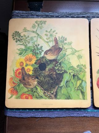 Conjunto de ilustraciones antiguas con motivos de aves y flores en madera - Detalle de pájaros posados sobre un nido. - Flores y ramas verdes en el fondo. Es un calendario antiguo de Pinturas Titán, probablemente de 1958 o 1966. Es un artículo de colección, a menudo vendido en sitios de subastas. La firma "J. Dávila" es visible en la esquina inferior derecha. se venden juntas a 15 euros cada una