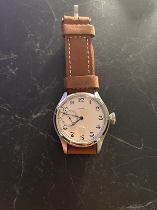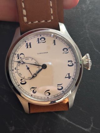 Elegante reloj Longines de bolsillo con esfera restaurada y pasado a reloj de muñeca con un diseño clásico y atemporal. La esfera es de color crema y los números son arábigos oscuro. La correa es de cuero marrón. -maquinaria 4394410 - Esfera de color crema. - Números arábigos negros -46mm sin contar corona - Correa de cuero marrón.
