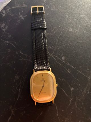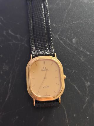 Elegante reloj Omega De Ville cuarzo con caja dorada y correa de piel negra. Tiene en la esfera una micro punzada la he intentado sacar en la antepenúltima foto es minima - Esfera dorada. - Correa de piel con textura. - Corona original