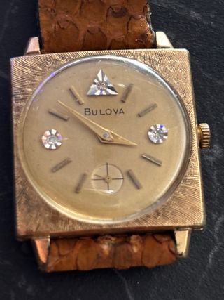 Elegante reloj Bulova vintage de cuerda con una esfera dorada y tres brillantes pequeños de los años 50/60 La correa es de piel en tono marrón con textura de la epoca Tiene un baño de oro de 10micras - Esfera cuadrada dorada. - Indicadores de hora con pequeños adornos. - Correa de piel con cierre de hebilla.