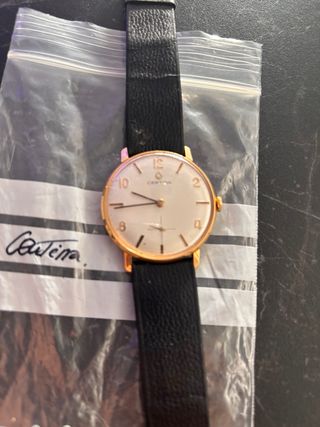 Elegante reloj Certina en estado prácticamente de estreno pese a sus años en condiciones excelentes con caja dorada y correa de piel negra de la marca - Esfera clara con números arábigos. - agujas he indices en negro poco vistos - Correa de piel negra con hebilla dorada.