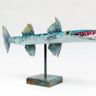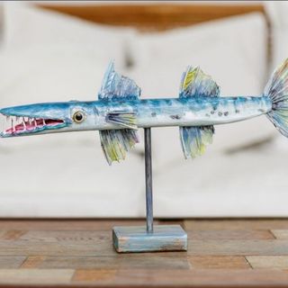 Preciosa escultura de Barracuda hecha a mano con madera recuperada (driftwood). Una pieza única de diseño sostenible, ideal para casas de playa o decoración de estilo costero. • Material: Madera tratada y recuperada. • Estado: Nuevo, directamente del artista. • Estilo: Arte marino, náutico, rústico moderno. • Incluye el soporte de metal y base de madera. Pieza exclusiva: no hay dos iguales. Perfecta para coleccionistas de arte o amantes del mar.