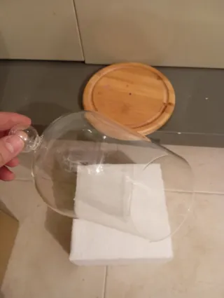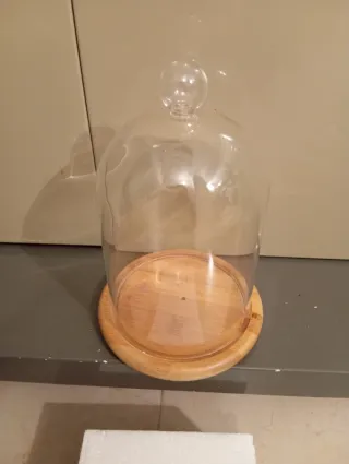 Cúpula de cristal con base de madera, inspirada en La Bella y la Bestia. - Diseño elegante y decorativo. - Materiales: Cristal y madera. La base tiene unas marcas rojas.