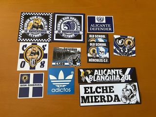 Conjunto de pegatinas de diferentes equipos y grupos. - Incluye diseños de C.D. Toledo, Frente Norte, Sabadell FC, R.B. 1987, Rudes Lleida, Ub,Boixos,Almería y FC Cartagena. - Variedad de estilos y temáticas.