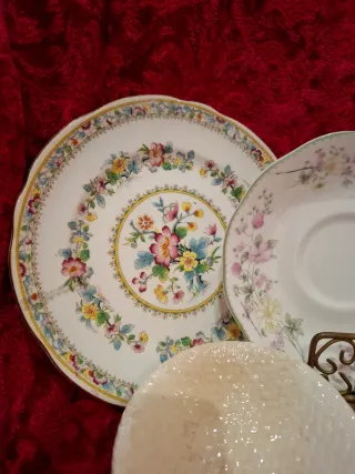 Conjunto de platos de porcelana con un diseño floral vintage. Ideal para añadir un toque clásico a tu mesa. Perfecto para postre o merienda. Bandeja para tartas o pastas y platitos para servir . Todos antiguos. Ingleses. Decora tu mesa con estilo. Ahora lo último es la mezcla de formas y colores. - Diseño floral en tonos naranjas y azules. - Borde decorado con motivos dorados y azules. - Piezas variadas para merienda. En mi perfil podrás encontrar. Antiguo antigua antigüedad vintage retro artdeco modernista antiguos antiguas restauracion 20 30 40 50 60 70 80 90 China japonés bristol francés italiano limoges bavaria arte oleo