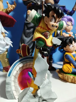 Figura de Gohan niño, personaje de Dragon Ball. - Detalle del traje amarillo y verde. - Base con efectos de energía y escombros.