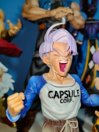 Figura de Trunks con su icónica camiseta de Capsule Corp. -24 cm -2 cabezas intercambiables - Figura de Trunks. - Camiseta blanca con logo de Capsule Corp. y mangas azules. - Pantalones anchos grises. - Botas negras y blancas.