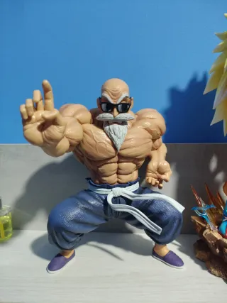 Figura coleccionable del Maestro Roshi. -27 cm - Diseño musculoso y detallado. - Incluye gafas de sol. - Pantalones azules con cinturón blanco. - Zapatos morados.