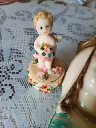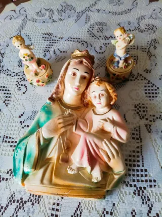 Conjunto de figuras decorativas religiosas. - Figura principal de la Virgen con el Niño. - Dos figuras de angelitos. - Detalles pintados a mano.