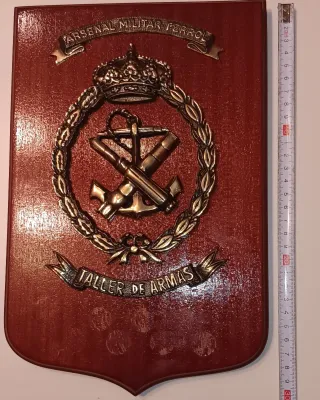 Metopa conmemorativa del Arsenal Militar de Ferrol, Taller de Armas. - Diseño con escudo central. - Inscripciones ARSENAL MILITAR FERROL y TALLER DE ARMAS. - Corona y ancla con cañón cruzados. En perfecto estado salvo las marcas de pegamento al quitarle la placa.