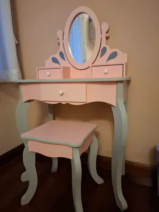Bonito tocador de madera en color rosa, diseñado para niños. Incluye un espejo ovalado y un taburete a juego. - Diseño con tres cajones. - Patas curvas decorativas.