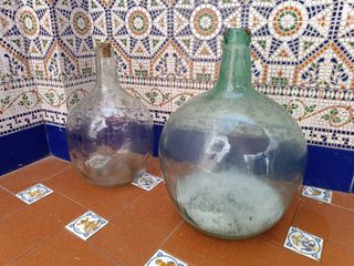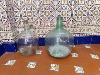 Bonitas damajuanas antiguas de cristal, ideales para decoración. Se venden juntas. - Dos damajuanas de cristal de diferentes tamaños. - Una de color verde claro y otra transparente. - Presentan un aspecto antiguo y desgastado, lo que les da encanto. Se venden juntas o separadas 15€ la grande y 15 la pequeña