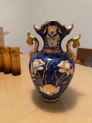 Elegante jarrón de estilo antiguo con un vibrante acabado azul y delicados detalles en dorado. - Diseño con asas. - Motivos florales. - Acabado brillante.