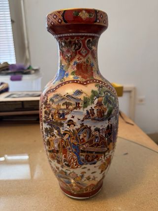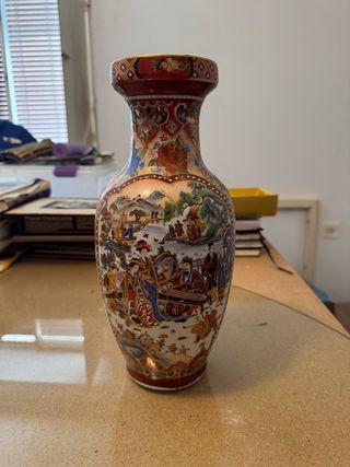Jarrón de porcelana con un diseño antiguo y detallado. - Decoración oriental. - Tonos vibrantes y dorados. - Acabado brillante.