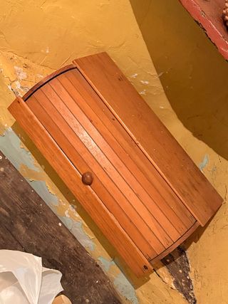 Panera de madera con un diseño clásico y funcional. Ideal para almacenar pan y otros alimentos. - Fabricada en madera. - Tapa enrollable con pomo. - Estilo vintage.