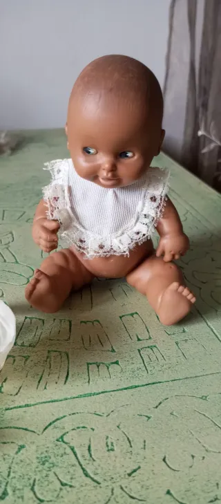 Muñeca Barriguitas bebé negro de principios de los 80s - Vestido con un babero blanco con detalles y pañal. - Ropa original, el pañal está roto y el babero un poco descosido. El muñeco tiene una mancha roja en una mano.