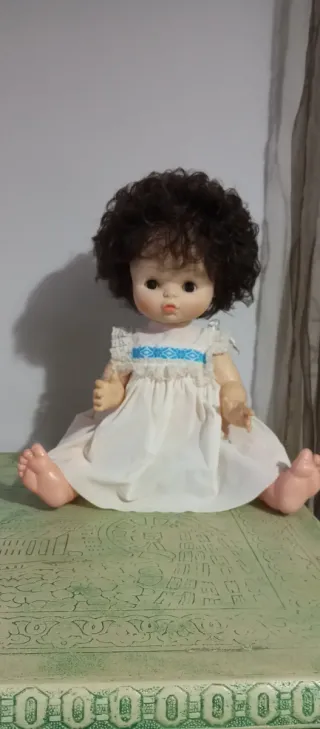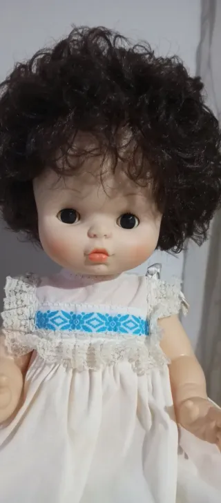 Muñeca Isma de Famosa del año 80. Conserva su vestido original y la peculiaridad de ser morena, la mayoría son rubias. - Pelo rizado y oscuro. - Vestido blanco con detalles azules. - Brazos y piernas articulados.