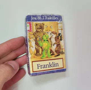 Juego de cartas Jeu de 7 Familles (Juego de 7 Familias) con los personajes de Franklin la Tortuga. Ideal para coleccionistas (baraja antigua) o para jugar. El juego está en FRANCÉS. La caja de la Baraja presenta signos de desgaste debido al paso del tiempo, y le falta una de las tapas. Entrego enfundadas tanto la caja como la Baraja de cartas para su mejor conservación. -La Baraja incluye bonitas ilustraciones de Franklin y sus amigos. - Juego de mesa clásico. - Formato de baraja de cartas. Si necesitas más información o más fotografías solamente tienes que pedírmelo!