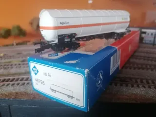 Vagón cisterna de la marca Roco, modelo Agip Gas, en escala HO. - Réplica detallada de vagón cisterna. - Diseño con los colores y logotipos de Agip Gas - Escala HO para maquetas de tren.