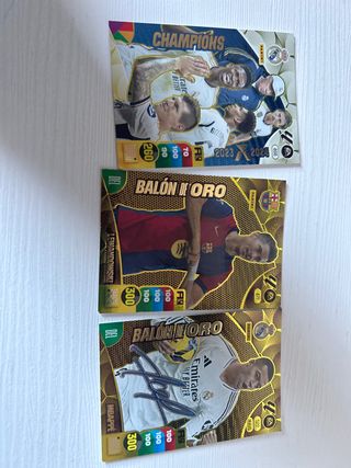 Colección de cartas especiales de fútbol Adrenalyn de la temporada 24-25. - Incluye cartas de Champions y Balón de Oro. - Jugadores destacados como Lewandowski y Mbappé. - Cartas con diferentes valores numéricos y de habilidad.
