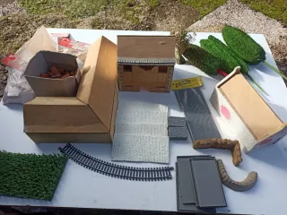 Lote de piezas para escenografía de maquetas o dioramas a escala 28mm. Casas para terminar, piezas de tejas, - Materiales variados para construcción y detalles. Todo lo de las fotos - Incluye elementos como vías de tren, tejados, vegetación y ladrillos.