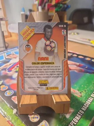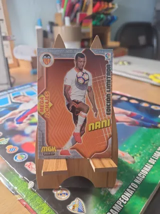 Tarjeta de fútbol de Nani de la colección Megacraks 2016-17 de Panini. - Edición limitada. - Incluye el escudo del Valencia CF. - Muestra al jugador Nani con el balón.