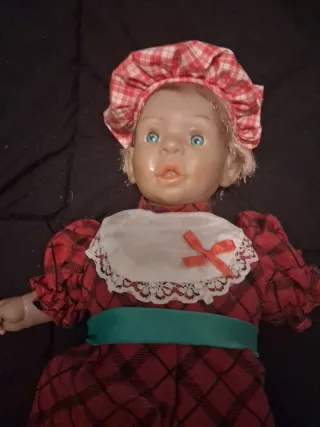 Este muñeco de los años 60 se encuentra en buen estado. - Ropa a cuadros roja y negra. - Pañuelo rojo. - Gorro a juego.