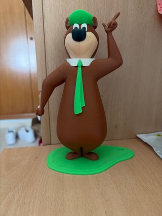 Figura decorativa del Oso Yogui, impresa en 3D. - Diseño del personaje con gorra verde y corbata. - Base verde que simula hierba.