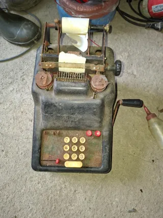 Registradora antigua de estilo mecánico, con un diseño clásico y robusto. Ideal para coleccionistas o como pieza decorativa. - Teclado numérico con botones. - Manivela lateral para operación. - Soporte para rollo de papel.