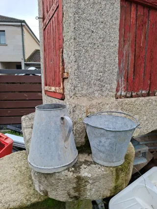 Conjunto de dos recipientes metálicos de estilo antiguo, perfectos para decoración o uso. Precio por unidad - Jarra de metal con asa. - Cubo de metal con asa. - Material: Metal galvanizado.