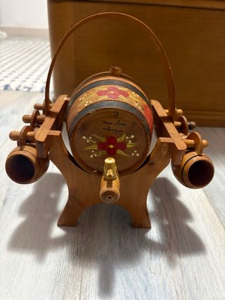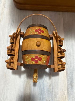 Este mini barril de madera es una pieza decorativa con un diseño pintado a mano. Mide aproximadamente 19cm de alto, 23cm de fondo y 26cm de ancho - Barril de madera. - Diseño pintado a mano con flores y detalles. - Incluye un asa de madera. - Soporte de madera con espacio para 6 copas.