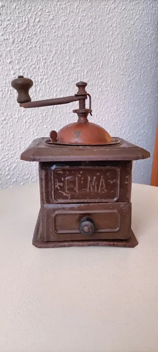 Molinillo de café antiguo de la marca ELMA. Un objeto con un diseño clásico y funcional. - Cuerpo metálico con acabado en color marrón. - Cajón extraíble para el café molido. - Manivela superior para moler.