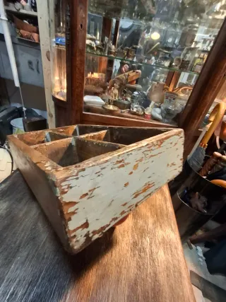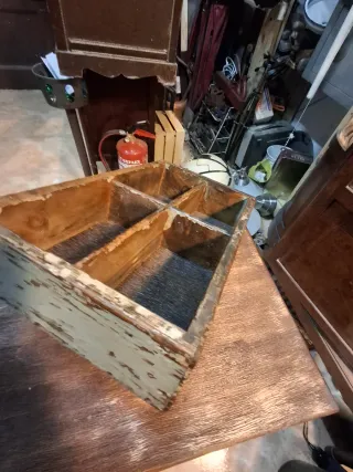 Caja de madera antigua con divisiones interiores. Ideal para organizar objetos pequeños o como pieza decorativa. ANTIGÜEDAD - Fabricada en madera. - Presenta divisiones internas para compartimentar. - Aspecto rústico y vintage.