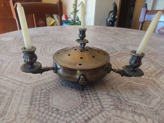Centro de mesa con patas, tapa y 3 candelabros con motivos florales Combina la función de un candelabro (con tres portavelas) y una base para colocar un plato o fuente caliente. La tapa perforada ayuda a disipar el calor cuando se usa como salvamanteles. El objeto es una antigüedad, probablemente de los años 50, con motivos florales. Es una pieza única y rara de encontrar. SE HACEN ENVÍOS WALLAPOP